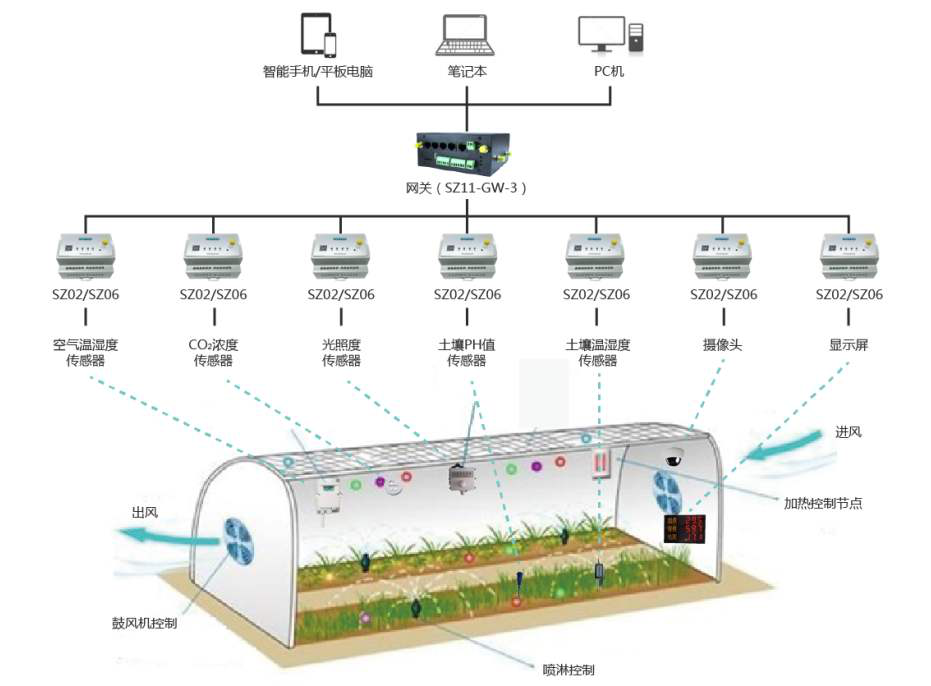 以生態(tài)溫室為例,隨著遠(yuǎn)程監(jiān)控系統(tǒng)、無線傳感器監(jiān)測等技術(shù)日趨成熟,物聯(lián)網(wǎng)、大數(shù)據(jù)等技術(shù)已逐步應(yīng)用到了生態(tài)農(nóng)業(yè)建設(shè)中。通過環(huán)境、動植物信息檢測,溫室農(nóng)業(yè)大棚信息檢測和標(biāo)準(zhǔn)化生產(chǎn)監(jiān)控,精準(zhǔn)農(nóng)業(yè)中的節(jié)水灌溉等應(yīng)用模式,提高了農(nóng)業(yè)生產(chǎn)的管理效率、提升了農(nóng)產(chǎn)品的附加值、加快了智慧農(nóng)業(yè)的建設(shè)步伐。其主要方式通過安裝于指定的監(jiān)測點的空氣溫濕度傳感器、土壤溫濕度傳感器、土壤PH傳感器、光合有效輻射傳感器、CO2傳感器等設(shè)備實時監(jiān)測空氣的溫濕度、二氧化碳濃度、土壤溫濕度及PH值等相關(guān)數(shù)據(jù);聯(lián)動控制系統(tǒng)由加熱、噴灌、通風(fēng)、卷簾設(shè)備及其配套PLC及Wifi設(shè)備服務(wù)器組成,當(dāng)傳感器采集的環(huán)境數(shù)據(jù)與標(biāo)準(zhǔn)值對比超出臨界范圍時,控制器自動啟動相關(guān)硬件設(shè)備對作物生長環(huán)境加熱、澆水、通風(fēng)、卷簾加減光照輻射,實現(xiàn)作物生長過程精確控制。同時在塑膜日光溫室旁,建立地下沼氣池,沼氣池上方建圈舍及廁所,形成一個封閉的智慧化能源生態(tài)系統(tǒng)。在此系統(tǒng)內(nèi),圈舍溫度在冬天提高3~5℃,為禽畜提供了更適宜的生長條件,使豬的生長期大幅縮短約150天。禽畜糞便為沼氣池提供原料,產(chǎn)出的沼氣用于家庭供暖,殘留的沼渣、沼液作為溫室作物的肥料。此外,豬等禽畜呼吸排出的CO2可促進(jìn)溫室內(nèi)作物光合作用,蔬菜產(chǎn)量和質(zhì)量明顯提高。