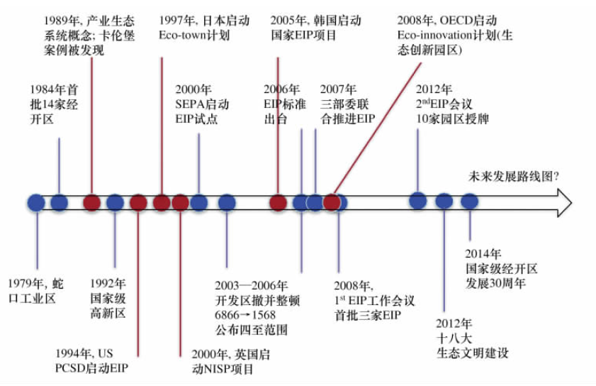 生態(tài)工業(yè)園區(qū)是產(chǎn)業(yè)生態(tài)學(xué)研究和實踐的重要載體之一。工業(yè)園區(qū)這一人工經(jīng)濟(jì)系統(tǒng)在發(fā)展中有意識地模仿自然生態(tài)系統(tǒng),應(yīng)用系統(tǒng)工程的理論和方法,對現(xiàn)有園區(qū)進(jìn)行重新規(guī)劃、設(shè)計和建設(shè),以提高資源、能源利用效率,減少污染物產(chǎn)生和排放,改善環(huán)境質(zhì)量,促進(jìn)經(jīng)濟(jì)持續(xù)發(fā)展。2000年以來,歐美國家、澳大利亞、日本、韓國、新加坡、印度、巴西等國家都出現(xiàn)了一系列關(guān)于生態(tài)工業(yè)園區(qū)案例的實證分析。工業(yè)發(fā)達(dá)國家生態(tài)工業(yè)園區(qū)發(fā)展的代表性例子包括丹麥、美國、英國、日本和韓國,下圖為幾個主要國家及中國推進(jìn)生態(tài)工業(yè)園區(qū)發(fā)展的演變概覽。發(fā)達(dá)國家現(xiàn)階段關(guān)于生態(tài)工業(yè)園區(qū)發(fā)展的重點問題主要集中在以下方面:(1)生態(tài)化發(fā)展的驅(qū)動力,包括園區(qū)建立物質(zhì)、能量、信息、廢棄物等集成系統(tǒng)過程中潛在干系方之間建立合作聯(lián)系的驅(qū)動力;(2)生態(tài)化發(fā)展準(zhǔn)則,目的是定義并識別推動生態(tài)化發(fā)展的創(chuàng)新行動(3)生態(tài)化發(fā)展成功要素,目的是從政治、經(jīng)濟(jì)、社會和環(huán)境識別各園區(qū)生態(tài)創(chuàng)新的成功要素;(4)定義針對推動園區(qū)生態(tài)創(chuàng)新有效發(fā)展和管理的關(guān)鍵問題。