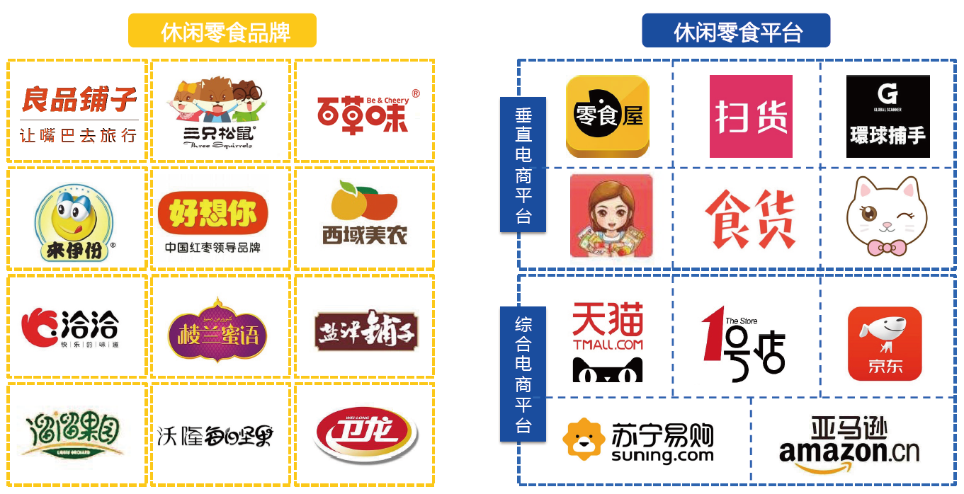 休閑零食企業(yè)主要分為兩類(lèi),品牌企業(yè)以及平臺(tái)企業(yè),平臺(tái)企業(yè)又分為綜合型電商平臺(tái)和零食類(lèi)目垂直平臺(tái)。