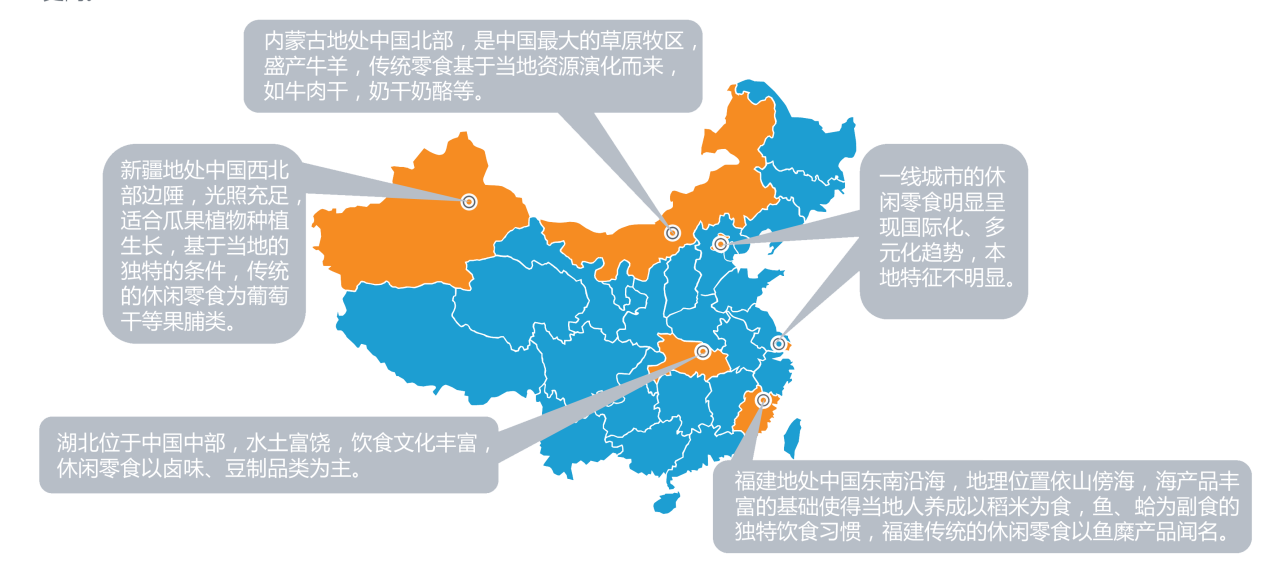 休閑食品的生產(chǎn)與農(nóng)業(yè)資源緊密相連。不同的地域有著截然不同的農(nóng)業(yè)資源,產(chǎn)業(yè)集中度較高,由此形成了眾多具備獨(dú)特資源優(yōu)勢(shì)的休閑食品品類(lèi),引領(lǐng)著中國(guó)休閑食品的發(fā)展潮流。目前,已經(jīng)興起了諸如福建軍團(tuán)、安徽炒貨軍團(tuán)、湖南辣食品、河南速凍食品軍團(tuán)等一大批優(yōu)秀的休閑食品企業(yè)。