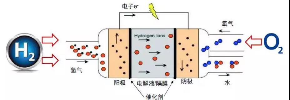 其工作原理是H2在陽極催化劑作用下被氧化成H+和e-,H+通過質(zhì)子交換膜達到政正極,與O2在陰極反應生成水,e-通過外電路達到陰極,連續(xù)不斷的反應就產(chǎn)生了電流。燃料電池雖帶有“電池”二字,卻不是傳統(tǒng)意義上的儲能設備,而是一種發(fā)電設備,這是燃料電池與傳統(tǒng)電池最大的區(qū)別。