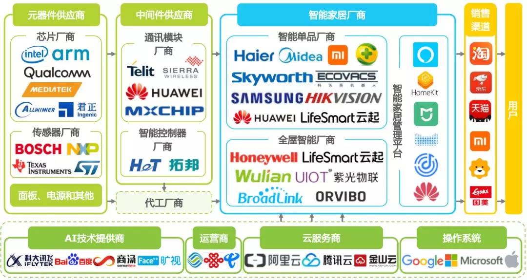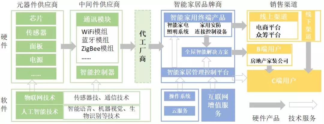 通常所指的智能家居企業(yè)為智能家居品牌商,涵蓋向最終用戶提供終端產(chǎn)品、解決方案和設(shè)備管理控制平臺(tái)的企業(yè),底層除物聯(lián)網(wǎng)操作系統(tǒng)、云服務(wù)作為管理控制平臺(tái)的支撐外,還包括內(nèi)容服務(wù)、生活服務(wù)等互聯(lián)網(wǎng)增值服務(wù)。智能家居產(chǎn)業(yè)鏈上游主要是芯片、傳感器等元器件供應(yīng),以及通訊模塊和智能控制器等中間件供應(yīng)商。品牌商可以通過線上、線下零售渠道直接向C端用戶銷售終端產(chǎn)品,也可以面向房地產(chǎn)、家裝公司等B端客戶提供整體解決方案。