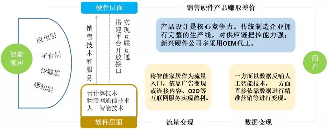 將智能家居劃分為硬件和軟件兩個(gè)層面,其中硬件對(duì)應(yīng)于智能家居的應(yīng)用層,軟件對(duì)于智能家居的平臺(tái)層、傳輸層和感知層。硬件產(chǎn)品的品牌方專注于產(chǎn)品側(cè)的設(shè)計(jì)和制造,向終端用戶提供的是智能家居的物理屬性,通過銷售硬件賺取差價(jià)實(shí)現(xiàn)盈利。針對(duì)智能家用產(chǎn)品的云計(jì)算、物聯(lián)網(wǎng)通信和人工智能三項(xiàng)核心技術(shù),技術(shù)供應(yīng)商通常會(huì)提供其中的一項(xiàng)或多項(xiàng)能力。他們既可以選擇直接通過向硬件廠商銷售技術(shù)和服務(wù)變現(xiàn),也可以選擇以硬件產(chǎn)品連接到海量的終端用戶,利用獲取到的用戶流量和數(shù)據(jù),通過面向消費(fèi)者的互聯(lián)網(wǎng)服務(wù)和面向企業(yè)的數(shù)據(jù)服務(wù)進(jìn)行變現(xiàn)。