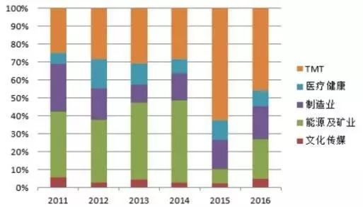 2011-2016 年各行業(yè)PE 投資活動規(guī)模(億美元)比較