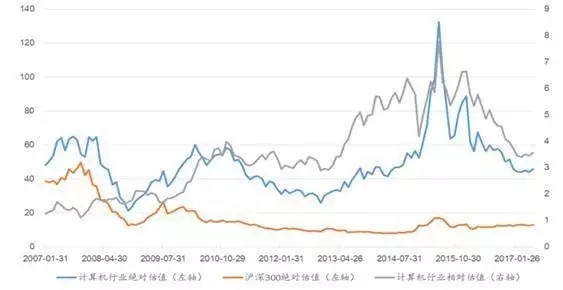 2007年至今計(jì)算機(jī)行業(yè)及滬深300股票絕對估值及計(jì)算機(jī)行業(yè)相對估值情況