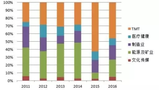 在國內(nèi) PE 投資方面,2016年TMT 行業(yè)投資熱度有所降低,但這與 2016 年市場整體投資節(jié)奏放緩有一定關(guān)系。如果從投資 的行業(yè)占比來看,TMT 和制造業(yè)仍然是最受投資機(jī)構(gòu)追捧的領(lǐng)域。