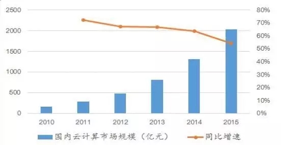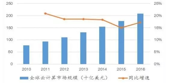 2016 年全球云計(jì)算市場規(guī)模達(dá)到 2086 億美元,同比增長 17.19%;從 2010 年至 2016 年,全球云計(jì)算的年 均復(fù)合增速達(dá)到 18.08%。而國內(nèi)云服務(wù)市場規(guī)模從 2010 年至 2015 年年均復(fù)合增速為 64.74%,領(lǐng)先全球增速。