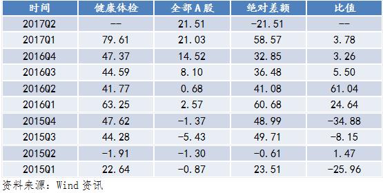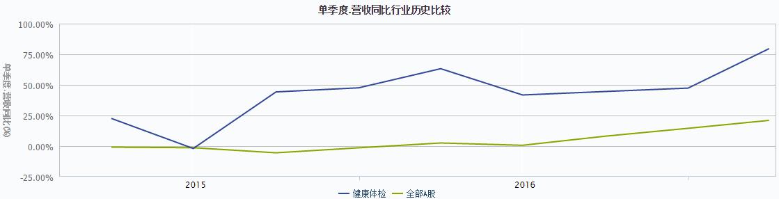 根據(jù)圖1數(shù)據(jù)顯示,從2015年第一季度到2017年第二季度,與全部A股相比,健康體檢行業(yè)的單季度營收同比總體處于較高水平,并表現(xiàn)為波動(dòng)增長的趨勢。