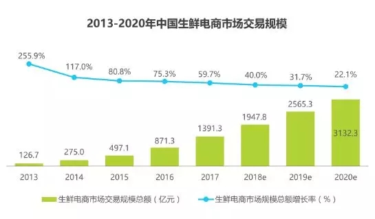 2017年中國生鮮電商市場交易規(guī)模約為1391.3億元,同比增長59.7%,預(yù)計2020年,生鮮電商交易規(guī)??梢赃_到3132億元。一方面基于消 費者消費習(xí)慣養(yǎng)成,另一方面基于冷鏈和倉儲系統(tǒng)迅速完善。