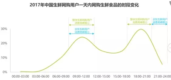 從消費時間來看,生鮮網(wǎng)購用戶購物的活躍曲線在09:00-12:00和18:00-21:00出現(xiàn)波峰,這兩個時間段分別對應(yīng)午餐前和晚餐前的使用時段,用戶可能選擇這兩個時間段網(wǎng)購午餐和晚餐所需要的食材。京東生鮮用戶消費的第一段高峰期和整體用戶基本一致,第二段高峰期時間為晚間21:00-22:00,相對靠后。艾瑞分析認為,京東生鮮B2C模式目前主要為次日達,用戶在平臺購買即時性晚餐食材的需求較小。