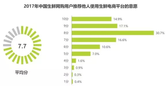 生鮮網(wǎng)購用戶推薦他人使用的意愿較強,整體推薦意愿的平均分為7.7分。30.7%的用戶推薦他人使用的意愿為8分,17.1%的用戶推薦他人使用的意愿為9分,14.9%的用戶推薦他人使用的意愿為10分。