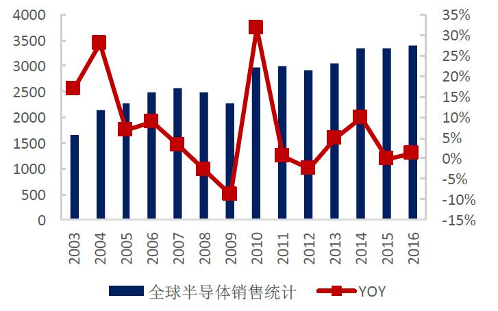 隨著全球經(jīng)濟(jì)的逐步復(fù)蘇,PC、手機(jī)、液晶電視等消費(fèi)類電子產(chǎn)品需求不斷增加,同時(shí)在以物聯(lián)網(wǎng)、可穿戴設(shè)備、云計(jì)算、大數(shù)據(jù)、新能源、醫(yī)療電子和安防電子等為主的新興應(yīng)用領(lǐng)域強(qiáng)勁需求的帶動(dòng)下,半導(dǎo)體銷售市場(chǎng)規(guī)模穩(wěn)定增長(zhǎng),預(yù)計(jì)2017年全球集成電路市場(chǎng)規(guī)模增長(zhǎng)至3465億美元。