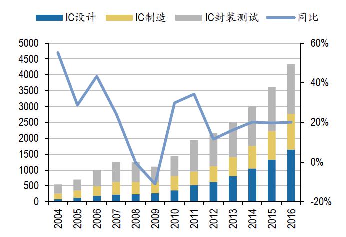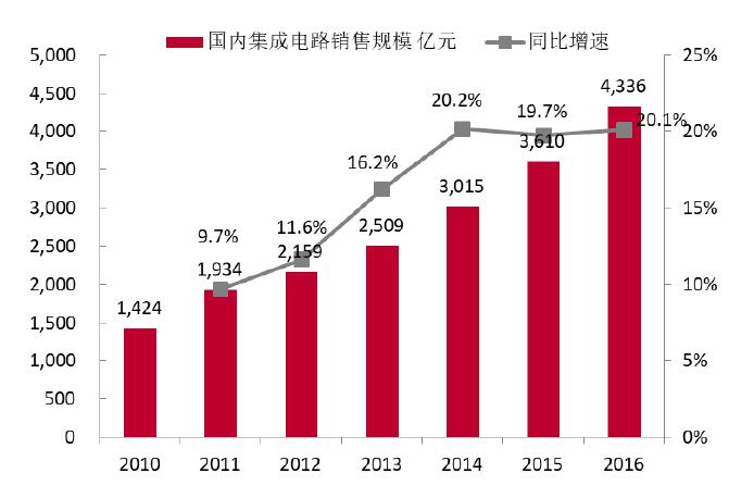 2016年中國(guó)集成電路產(chǎn)業(yè)繼續(xù)高速增長(zhǎng)的勢(shì)頭,從半導(dǎo)體行業(yè)協(xié)會(huì)的2017年最新統(tǒng)計(jì),2016年中國(guó)集成電路產(chǎn)業(yè)銷售額高達(dá)4335.5億元,比2015年增長(zhǎng)20.1%。
