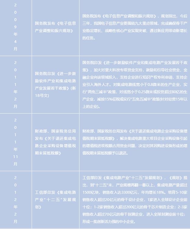 2011年出臺(tái)的《國(guó)務(wù)院關(guān)于印發(fā)進(jìn)一步鼓勵(lì)軟件產(chǎn)業(yè)和集成電路產(chǎn)業(yè)發(fā)展若干政策的通知》,提出要大力支持軟件和集成電路重大關(guān)鍵技術(shù)的研發(fā),努力實(shí)現(xiàn)關(guān)鍵技術(shù)的整體突破,加快具有自主知識(shí)產(chǎn)權(quán)技術(shù)的產(chǎn)業(yè)化和推廣應(yīng)用,重點(diǎn)支持高端芯片、集成電路裝備和工藝技術(shù)、集成電路關(guān)鍵材料、關(guān)鍵應(yīng)用系統(tǒng)的研發(fā)以及重要技術(shù)標(biāo)準(zhǔn)的制訂;在《電子信息制造業(yè)“十二五”發(fā)展規(guī)劃》和《集成電路產(chǎn)業(yè)“十二五”發(fā)展規(guī)劃》中也均提出要著力發(fā)展芯片設(shè)計(jì)業(yè),壯大芯片制造業(yè),開(kāi)發(fā)髙性能集成電路產(chǎn)品,增強(qiáng)先進(jìn)和特色工藝能力。