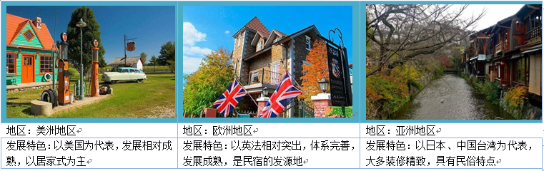 發(fā)展特色:以美國為代表,發(fā)展相對成熟,以居家式為主 發(fā)展特色:以英法相對突出,體系完善,發(fā)展成熟,是民宿的發(fā)源地 發(fā)展特色:以日本、中國臺灣為代表,大多裝修精致,具有民俗特點(diǎn)