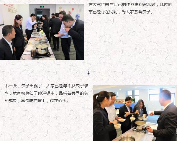 大家分成“愛(ài)吃餃子”“會(huì)做餃子”“多彩生活”和“幸?;▋骸彼膫€(gè)組合,展開了包餃子比賽。只見他們熟練的搟面皮、放餡料、捏餃子,十指翻飛之間,剁餡聲、歡笑聲、音樂(lè)聲,交織在一起,每個(gè)人臉上都洋溢著燦爛的笑容,公司里充滿了歡聲笑語(yǔ),匯聚成了一片歡樂(lè)的海洋。